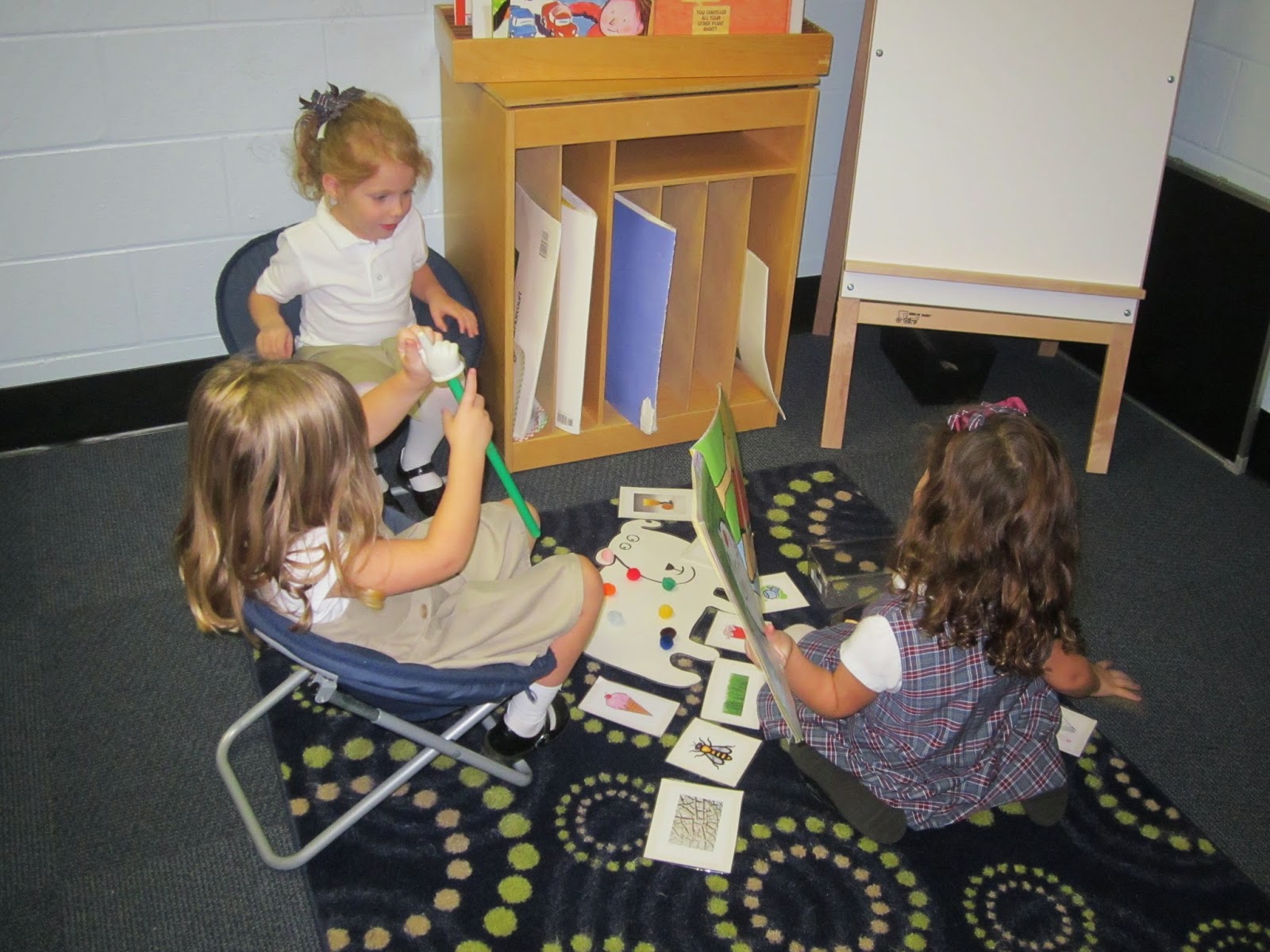 After introducing the letter sound /G/, Mrs. "B" used the letters we have introduced so far on the "blending board". Children blend the 3 letter sounds together and then decide if the word is a real word or a nonsense word.